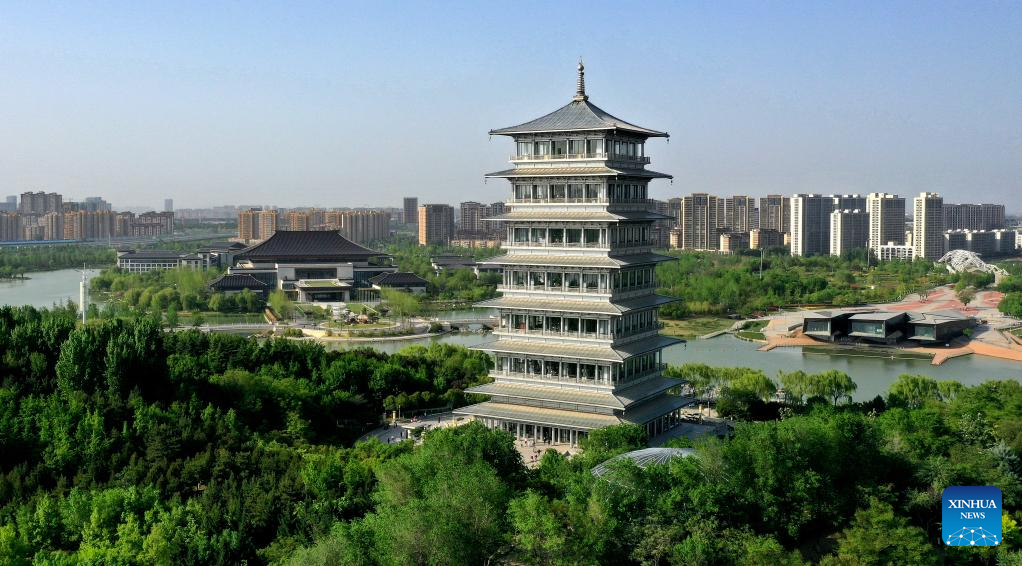 This aerial photo taken on April 25, 2023 shows a view of the Tang Paradise in Xi'an, northwest China's Shaanxi Province. (Xinhua/Liu Xiao)