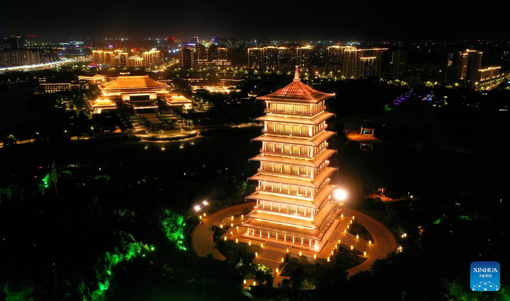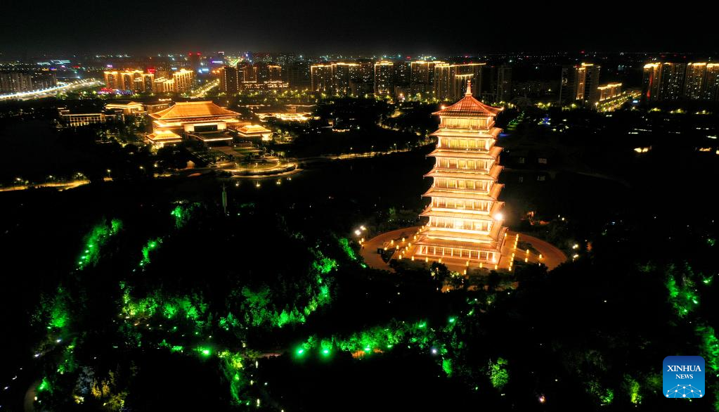 This aerial photo taken on May 1, 2023 shows a night view of the Chang'an Tower at the Chanba ecological zone in Xi'an, northwest China's Shaanxi Province. (Xinhua/Liu Xiao)