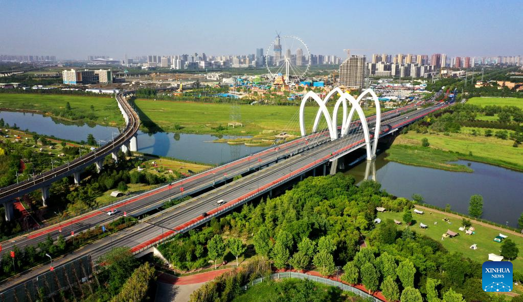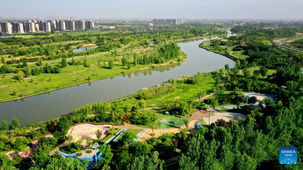 This aerial photo taken on April 29, 2023 shows a view along the Fenghe River at Xixian New Area in Xi'an, northwest China's Shaanxi Province. (Xinhua/Liu Xiao)