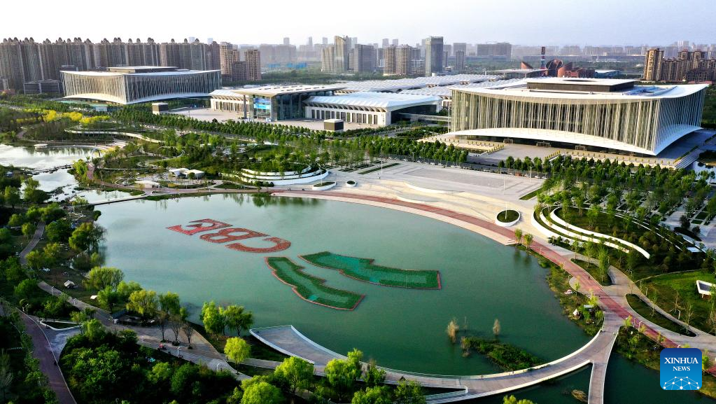 This aerial photo taken on April 16, 2023 shows a view of the Xi'an international convention center at the Chanba ecological zone in Xi'an, northwest China's Shaanxi Province. (Xinhua/Liu Xiao)