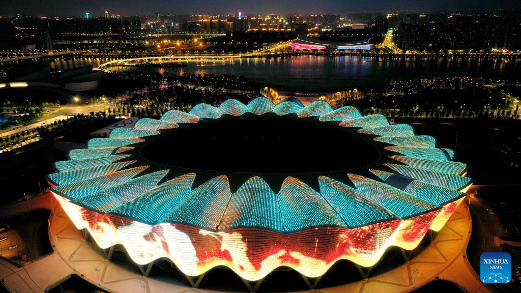 This aerial photo taken on May 1, 2023 shows a night view of the Olympic Sports Center in Xi'an, northwest China's Shaanxi Province. (Xinhua/Liu Xiao)