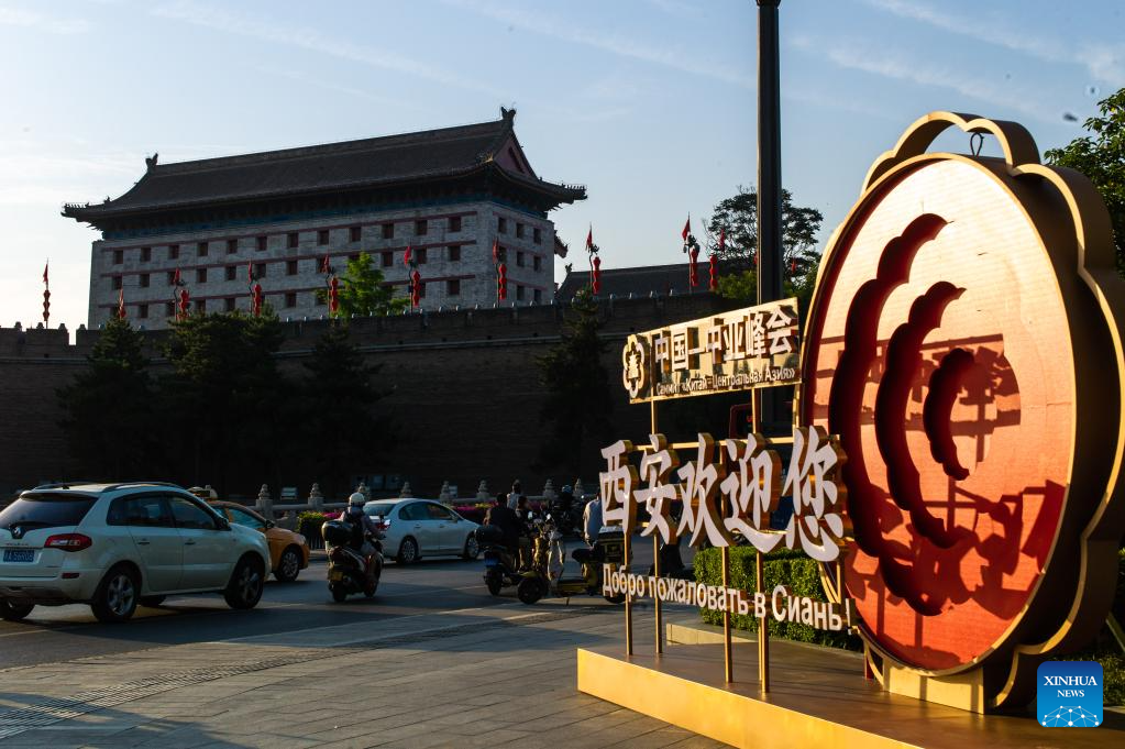 This photo taken on May 16, 2023 shows an installation of the China-Central Asia Summit in Xi'an, northwest China's Shaanxi Province. The China-Central Asia Summit is set to take place in Xi'an, the capital city of China's Shaanxi Province, on May 18 and 19. (Xinhua/Li Jing)