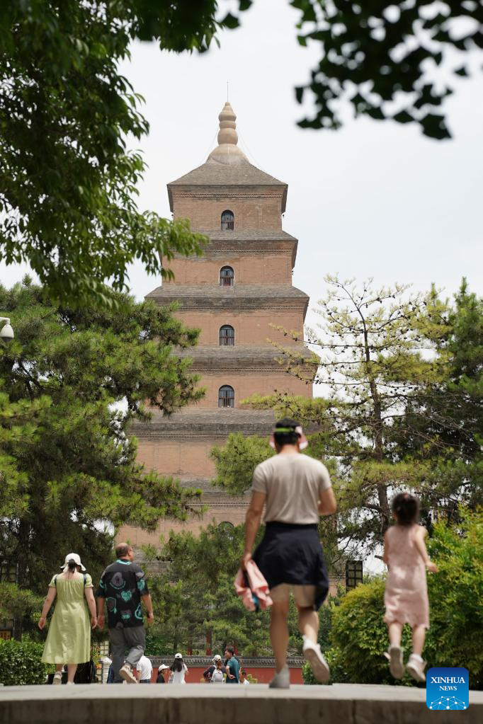 Tourists visit the Giant Wild Goose Pagoda scenic area in Xi'an, northwest China's Shaanxi Province, May 16, 2023. The China-Central Asia Summit is set to take place in Xi'an, the capital city of China's Shaanxi Province, on May 18 and 19. (Xinhua/Shao Rui)