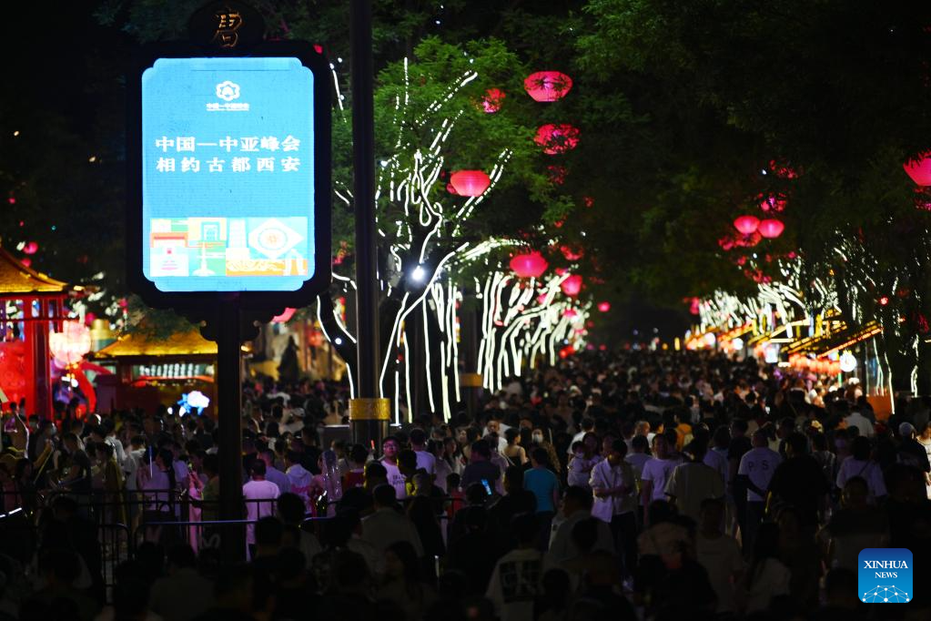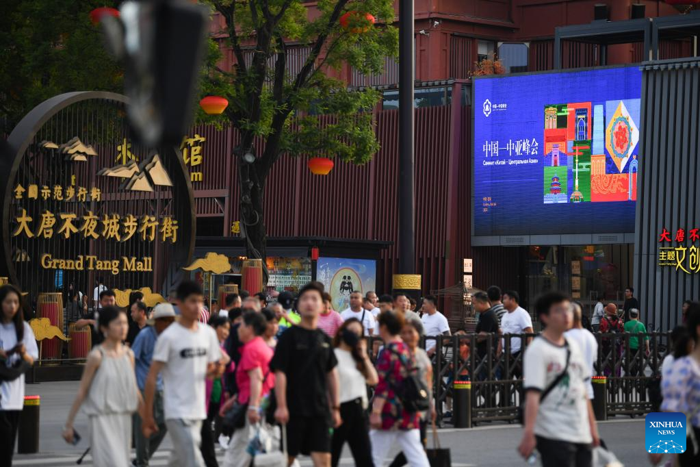 Tourists visit the Datang Everbright City scenic area in Xi'an, northwest China's Shaanxi Province, May 15, 2023. The China-Central Asia Summit is set to take place in Xi'an, the capital city of China's Shaanxi Province, on May 18 and 19. (Xinhua/Li Yibo)
