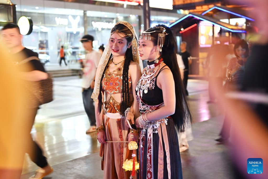 Tourists visit the Datang Everbright City scenic area in Xi'an, northwest China's Shaanxi Province, May 15, 2023. The China-Central Asia Summit is set to take place in Xi'an, the capital city of China's Shaanxi Province, on May 18 and 19. (Xinhua/Song Weiwei)