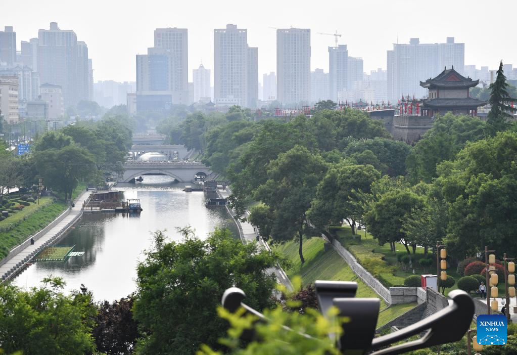 This photo taken on May 15, 2023 shows a view of a scenic moat area along the ancient city wall in Xi'an, northwest China's Shaanxi Province. The China-Central Asia Summit is set to take place in Xi'an, the capital city of China's Shaanxi Province, on May 18 and 19. (Xinhua/Zhang Bowen)