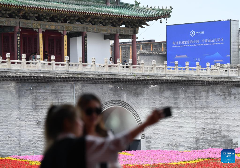 Tourists take photos with an installation of the China-Central Asia Summit in Xi'an, northwest China's Shaanxi Province, May 16, 2023. The China-Central Asia Summit is set to take place in Xi'an, the capital city of China's Shaanxi Province, on May 18 and 19. (Xinhua/Li Yibo)