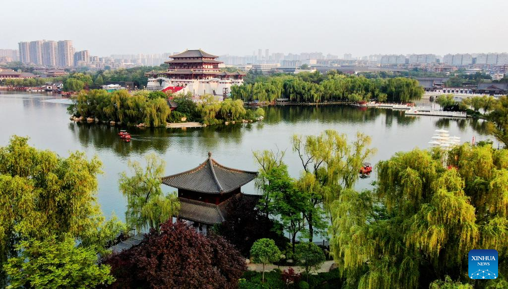 This aerial photo taken on April 19, 2023 shows the view of the Tang Paradise in Xi'an, northwest China's Shaanxi Province. The Tang Paradise, located in the south of Xi'an, is a large cultural theme park showing the life style of the prosperous Tang Dynasty (618-907). (Xinhua/Liu Xiao)