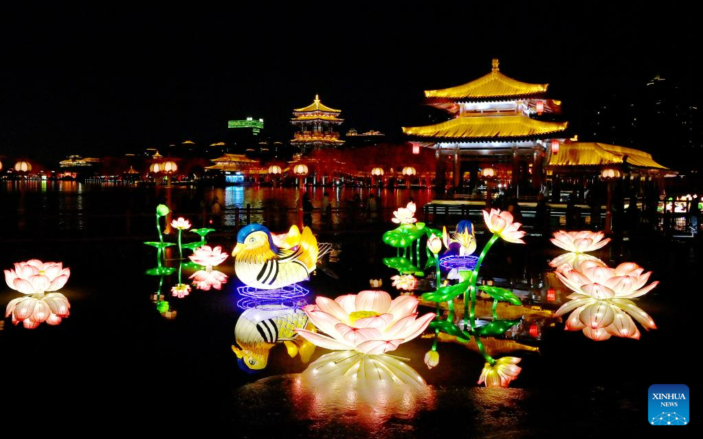 This photo taken on Jan. 24, 2023 shows the night view of the Tang Paradise in Xi'an, northwest China's Shaanxi Province. The Tang Paradise, located in the south of Xi'an, is a large cultural theme park showing the life style of the prosperous Tang Dynasty (618-907). (Xinhua/Liu Xiao)