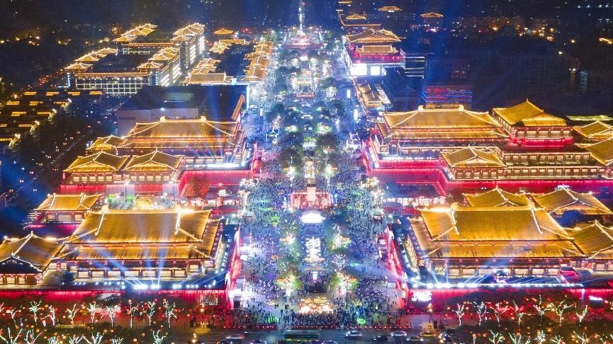 Photo taken on April 18, 2023 shows a night view of the Datang Everbright City, a tourist landmark of Xi'an featuring a grand street with characteristics of the Tang Dynasty (618-907). (People's Daily Online/Sun Lijun)