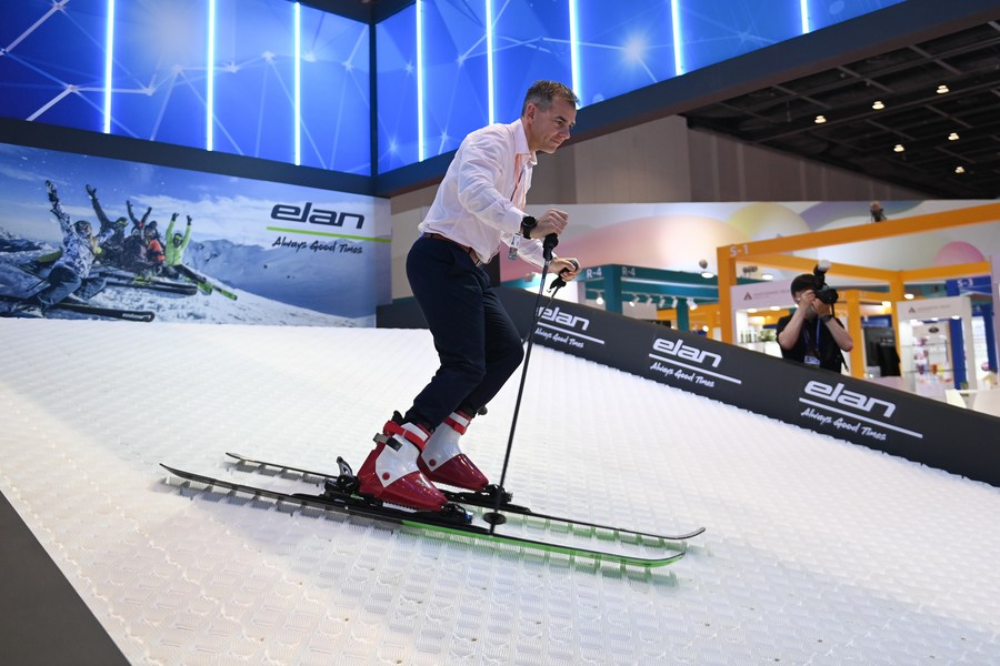 An enterprise delegate from Slovenia displays ski equipment at the China-Central &Eastern European Countries (CEEC) Expo in Ningbo, east China's Zhejiang Province, May 16, 2023. (Xinhua/Huang Zongzhi)