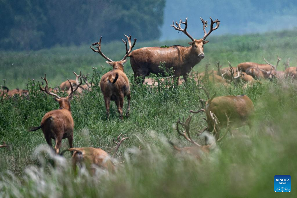 This photo taken on May 19, 2023 shows milu deer at Shishou Milu Deer National Nature Reserve in central China's Hubei Province. After years of efforts by protectors and continuous improvement of the local ecological environment, the population of milu deer at the nature reserve has increased rapidly. (Xinhua/Hui Xiaoyong)
