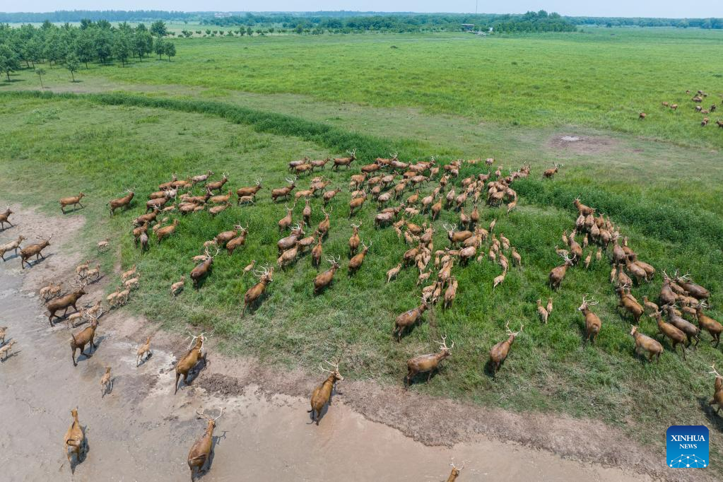 This aerial photo taken on May 19, 2023 shows milu deer at Shishou Milu Deer National Nature Reserve in central China's Hubei Province. After years of efforts by protectors and continuous improvement of the local ecological environment, the population of milu deer at the nature reserve has increased rapidly. (Xinhua/Xiao Yijiu)