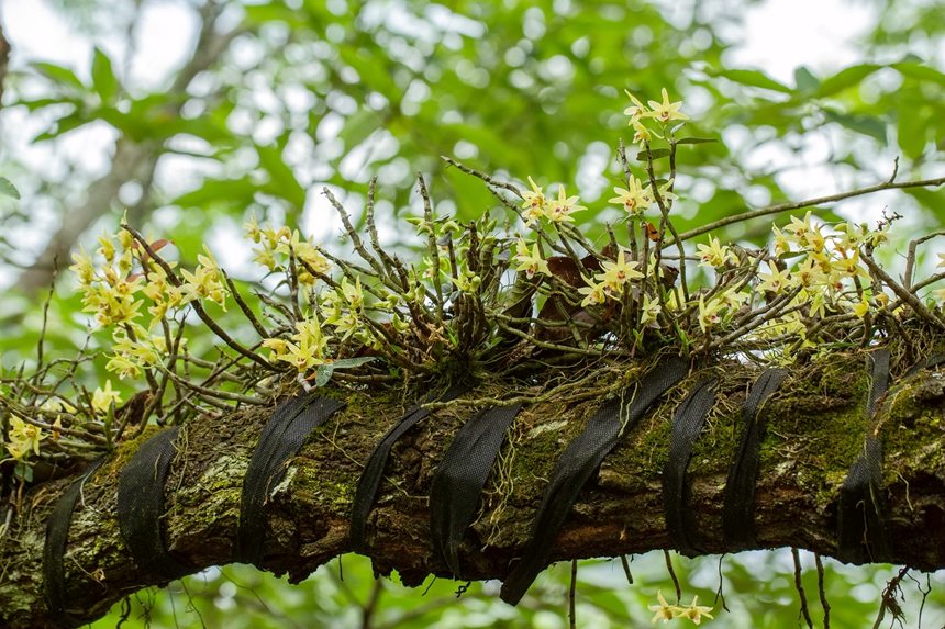 Light yellow flowers recently adorned trees inside a 1,000-mu (66.67 hectares) quasi-wild dendrobium catenatum planting base in Zhoubang village, Xilin county, Baise, southwest China's Guangxi Zhuang Autonomous Region.