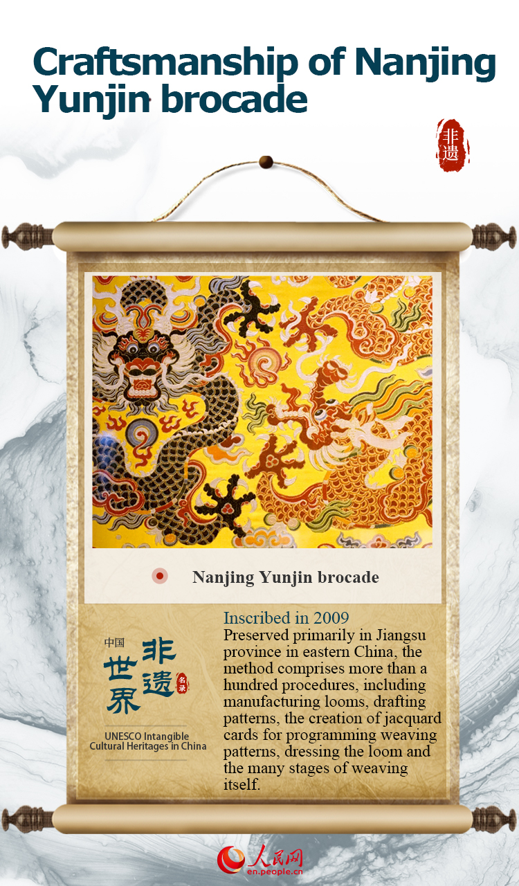 The item, "Craftsmanship of Nanjing Yunjin brocade" was inscribed on UNESCO's Representative List of the Intangible Cultural Heritage of Humanity in 2009.