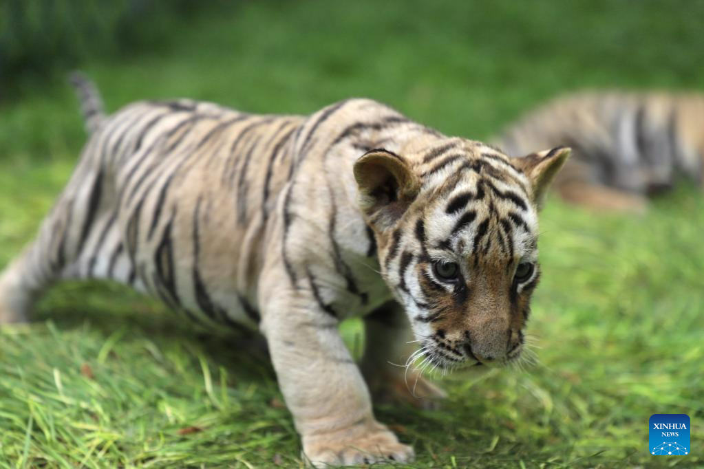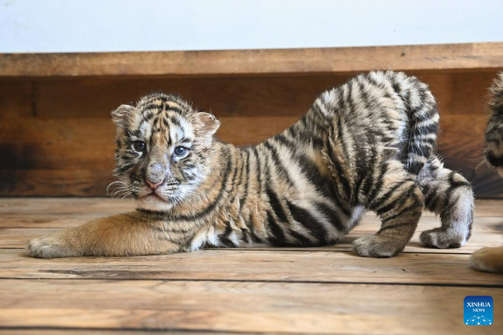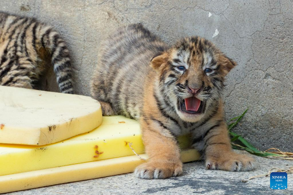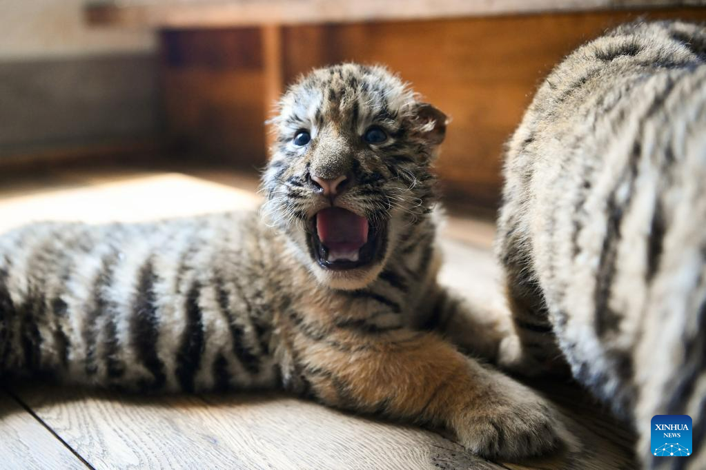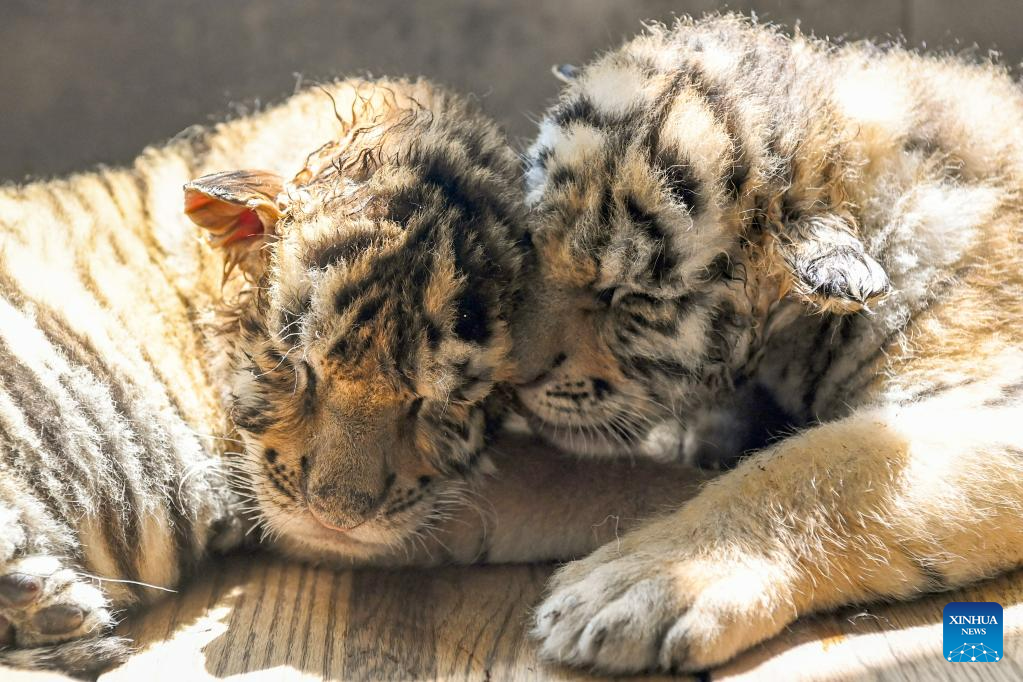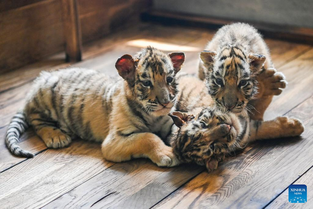 This photo taken on June 13, 2023 shows Siberian tiger cubs at the Siberian Tiger Park in Harbin, northeast China's Heilongjiang Province. The Siberian Tiger Park is a key breeding base of the China Hengdaohezi Feline Breeding Center. More than 10 Siberian tiger cubs have been born here this year. (Xinhua/Xie Jianfei)