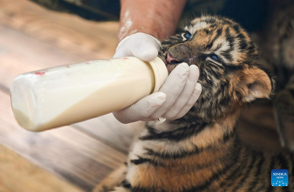 A staff member feeds a Siberian tiger cub at the Siberian Tiger Park in Harbin, northeast China's Heilongjiang Province, June 13, 2023. The Siberian Tiger Park is a key breeding base of the China Hengdaohezi Feline Breeding Center. More than 10 Siberian tiger cubs have been born here this year. (Xinhua/Xie Jianfei)