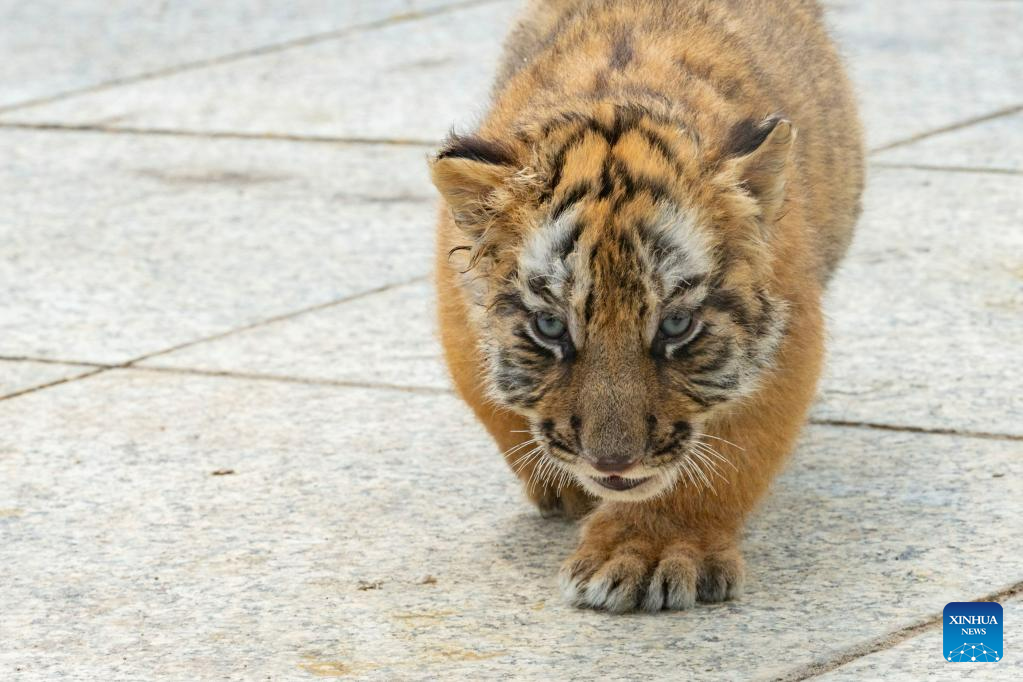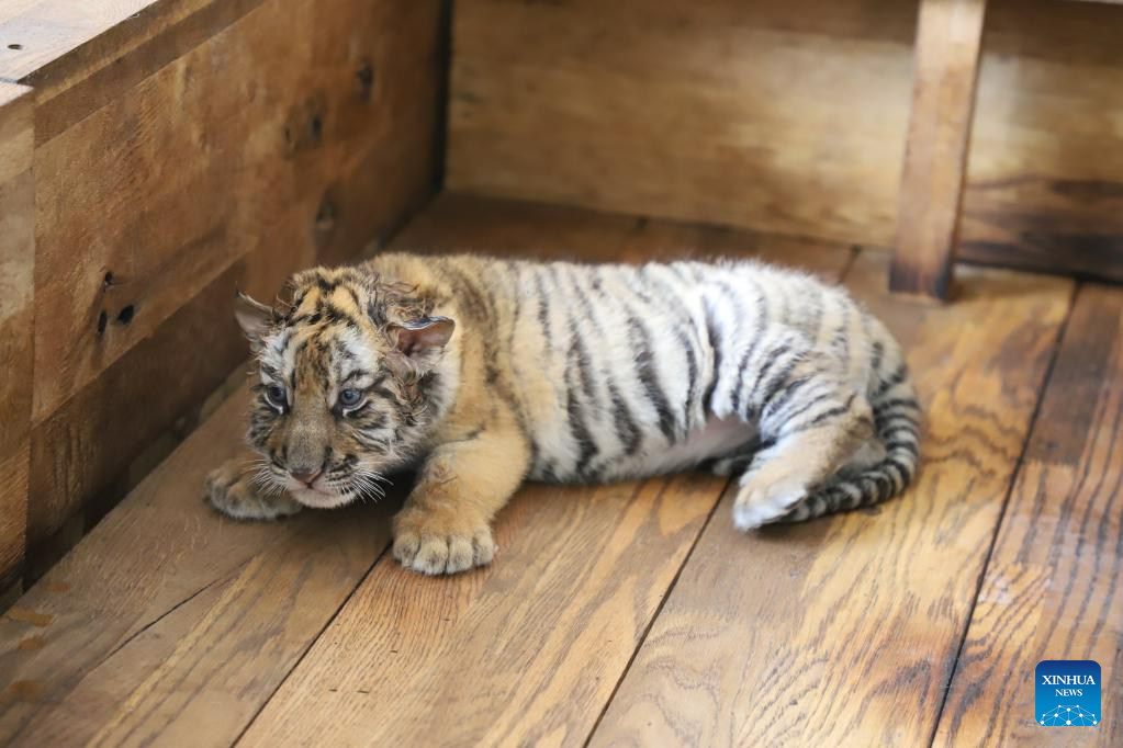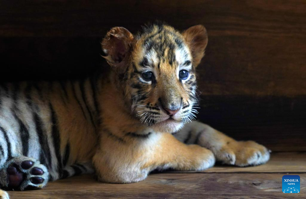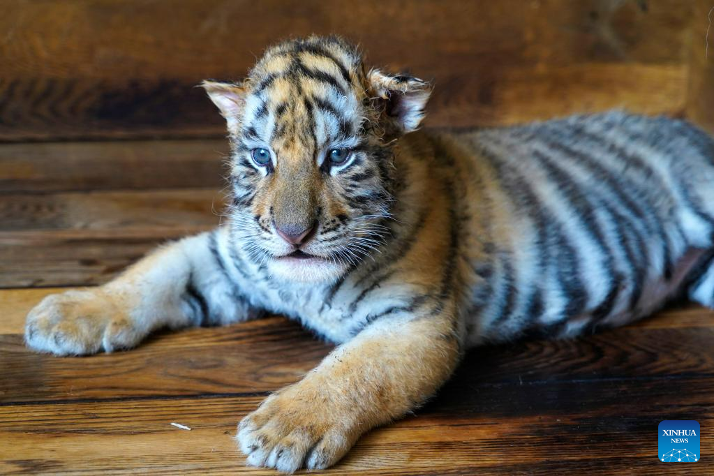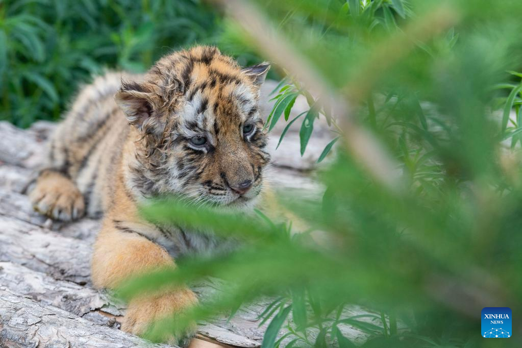 This photo taken on June 13, 2023 shows a Siberian tiger cub at the Siberian Tiger Park in Harbin, northeast China's Heilongjiang Province. The Siberian Tiger Park is a key breeding base of the China Hengdaohezi Feline Breeding Center. More than 10 Siberian tiger cubs have been born here this year. (Xinhua/Wang Dayu)