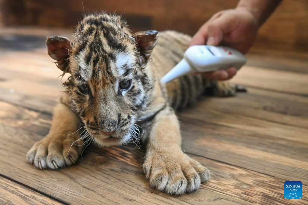 A staff member takes the temperature of a Siberian tiger cub at the Siberian Tiger Park in Harbin, northeast China's Heilongjiang Province, June 13, 2023. The Siberian Tiger Park is a key breeding base of the China Hengdaohezi Feline Breeding Center. More than 10 Siberian tiger cubs have been born here this year. (Xinhua/Xie Jianfei)