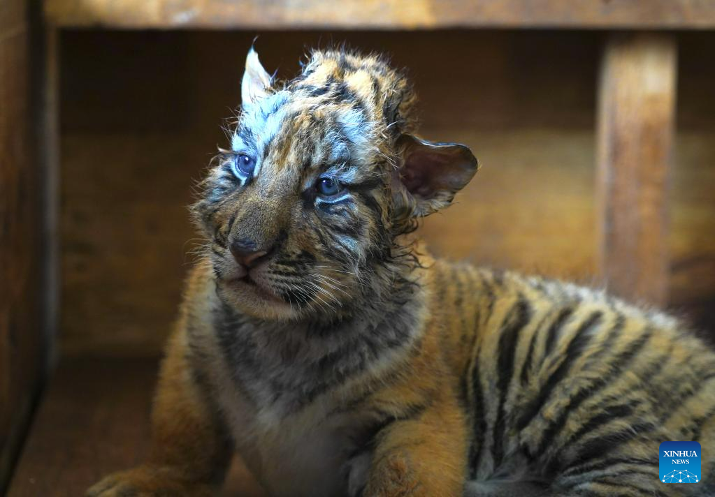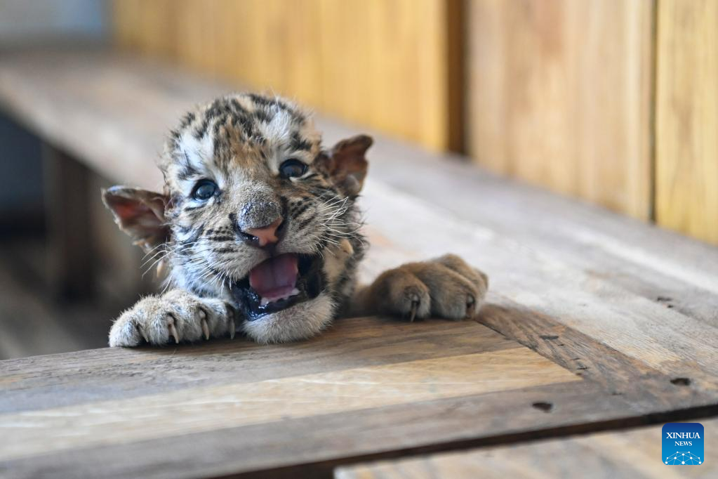 This photo taken on June 13, 2023 shows a Siberian tiger cub at the Siberian Tiger Park in Harbin, northeast China's Heilongjiang Province. The Siberian Tiger Park is a key breeding base of the China Hengdaohezi Feline Breeding Center. More than 10 Siberian tiger cubs have been born here this year. (Xinhua/Xie Jianfei)
