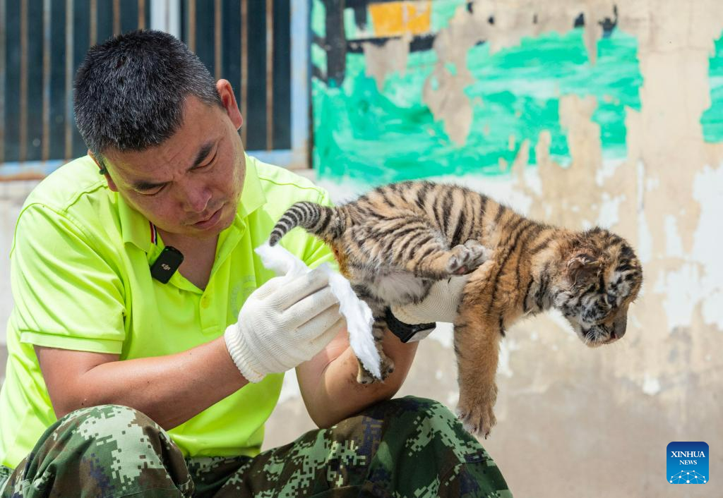 A staff member cleans a Siberian tiger cub at the Siberian Tiger Park in Harbin, northeast China's Heilongjiang Province, June 13, 2023. The Siberian Tiger Park is a key breeding base of the China Hengdaohezi Feline Breeding Center. More than 10 Siberian tiger cubs have been born here this year. (Xinhua/Xie Jianfei)