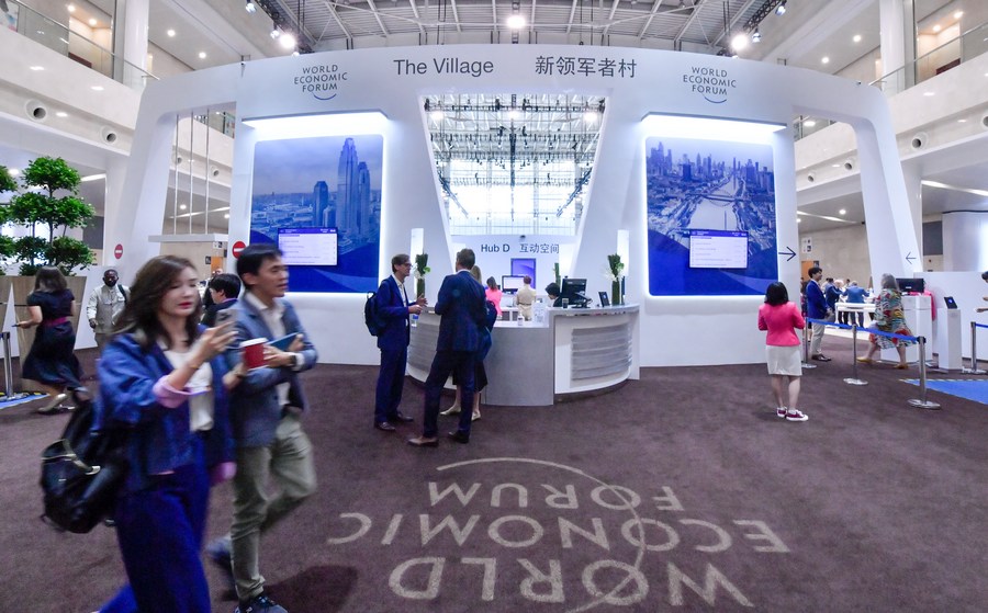 This photo taken on June 27, 2023 shows a view of the venue for the 14th Annual Meeting of the New Champions, also known as the Summer Davos, in north China's Tianjin Municipality. (Xinhua/Sun Fanyue)
