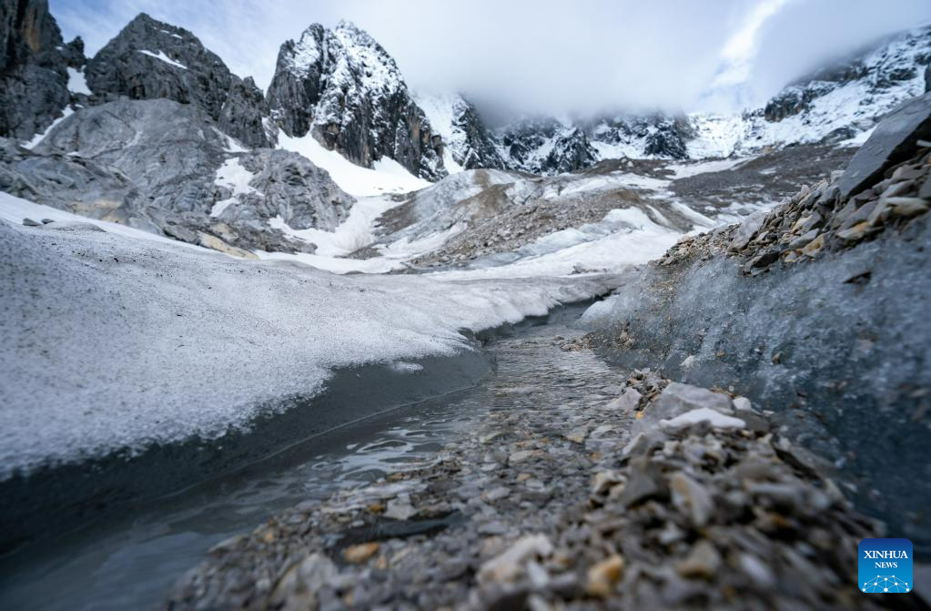 This photo taken on June 16, 2023 shows the meltwater of Baishui River No. 1 Glacier on the Yulong Snow Mountain in Lijiang City, southwest China's Yunnan Province. (Xinhua/Chen Xinbo)