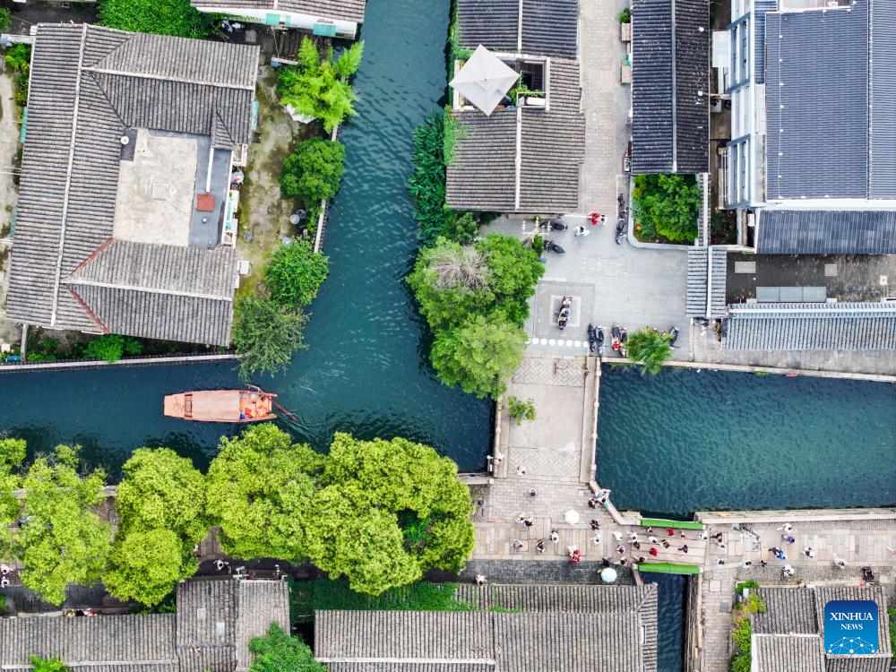 This aerial photo taken on July 3, 2023 shows a view of a historic and cultural block of Pingjiang Road in Suzhou, east China's Jiangsu Province. Suzhou, a city with a history of over 2,500 years, is referred to as heaven on earth in a famous Chinese adage. (Xinhua/Li Bo)