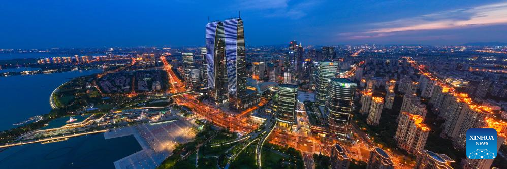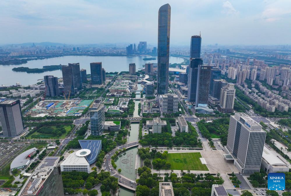 This aerial photo taken on July 4, 2023 shows a view by the Jinji Lake in Suzhou, east China's Jiangsu Province. Suzhou, a city with a history of over 2,500 years, is referred to as heaven on earth in a famous Chinese adage. (Xinhua/Li Bo)