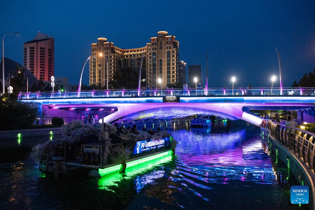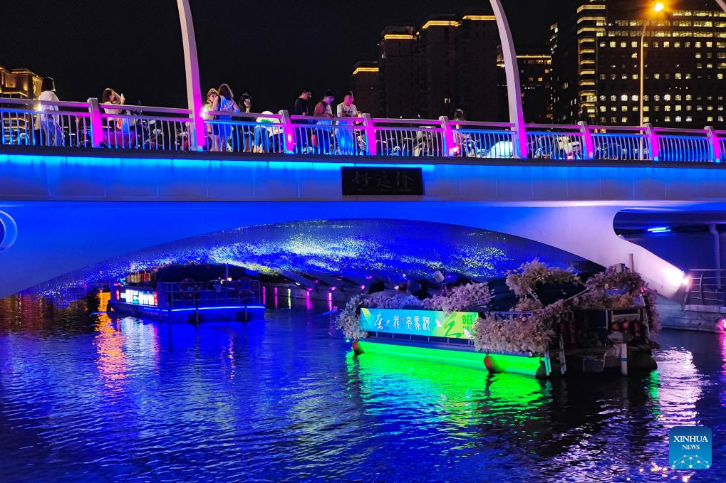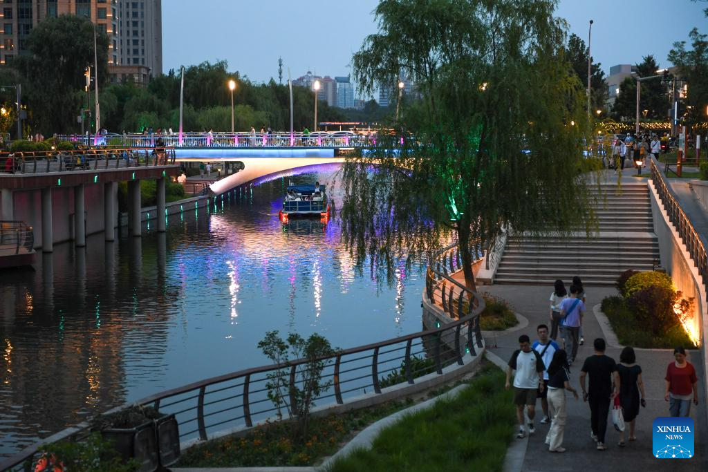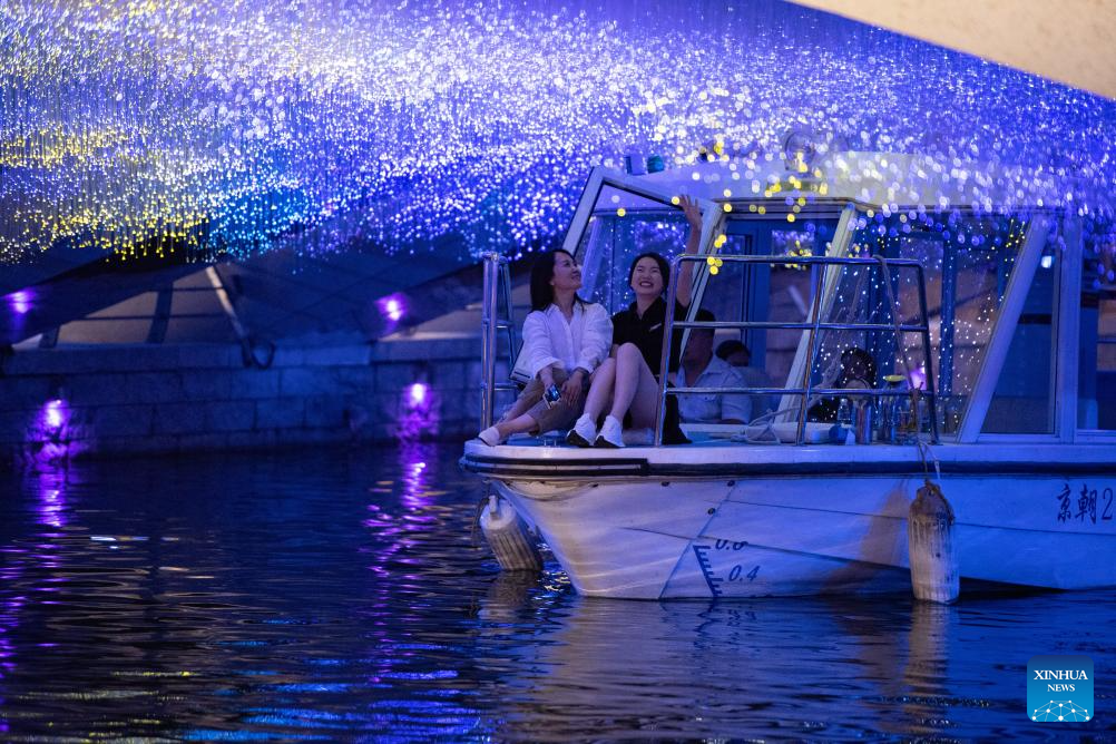 Tourists take an evening boat tour along the Liangma River in Beijing, capital of China, June 25, 2023. (Xinhua/Sun Ruibo)