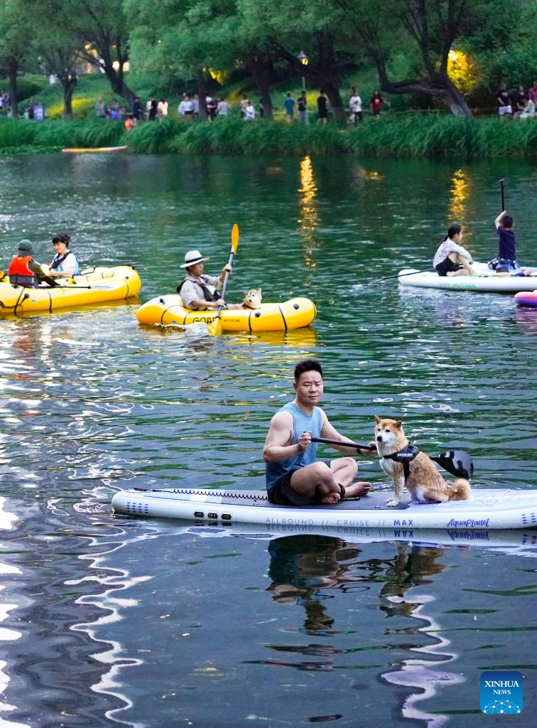 People enjoy paddleboarding on the Liangma River in Beijing, capital of China, June 23, 2023. (Xinhua/Ju Huanzong)