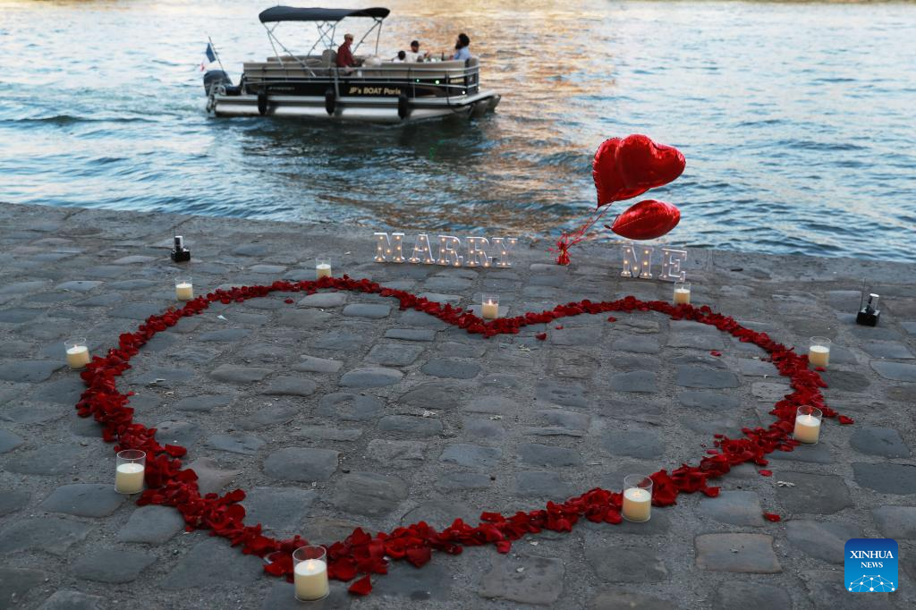A marriage proposal takes place by the Seine River in Paris, France, June 27, 2023. (Xinhua/Gao Jing)