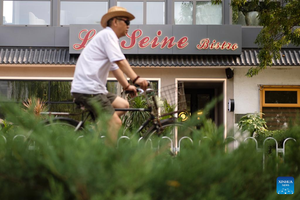 A biker rides past a western restaurant named "La Seine" by the Liangma River in Beijing, capital of China, June 25, 2023. (Xinhua/Sun Ruibo)