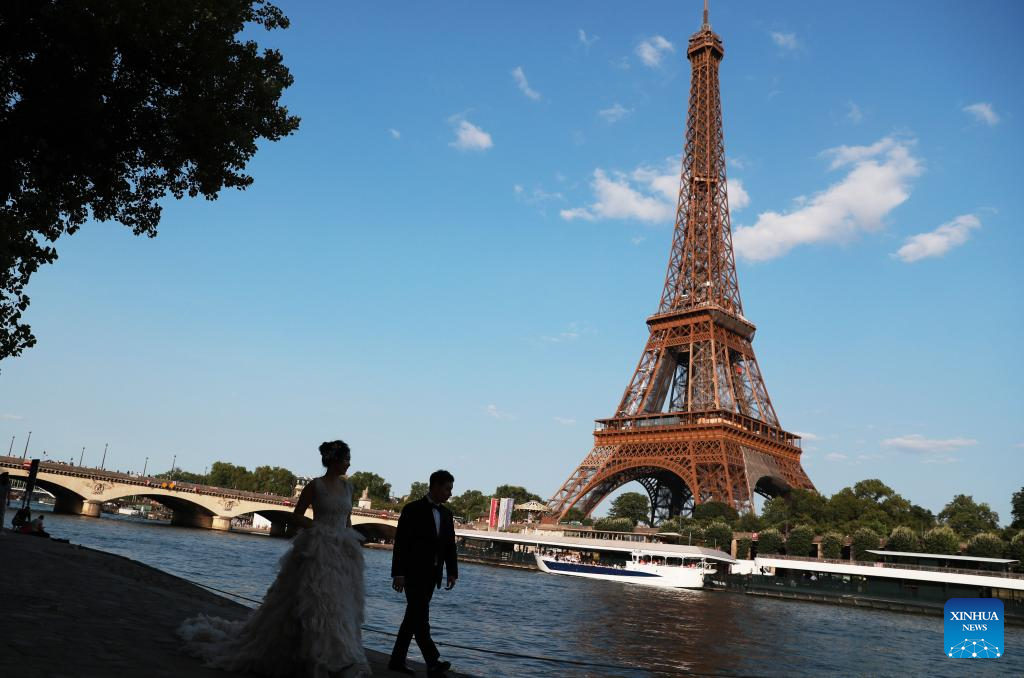 A couple from China poses for wedding photos by the Seine River in Paris, France, June 27, 2023. (Xinhua/Gao Jing)