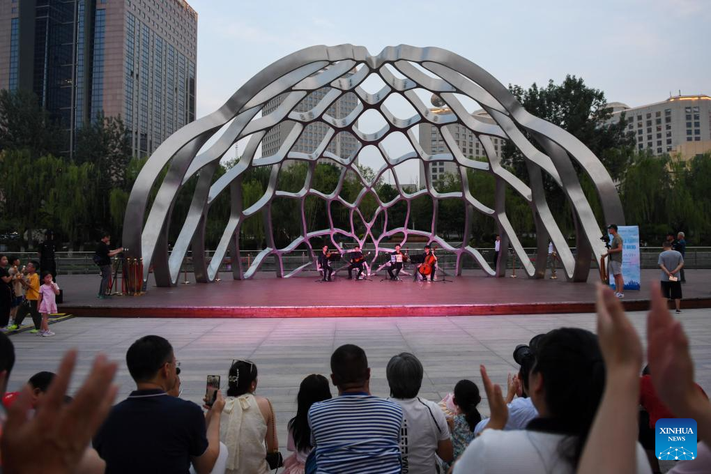 People watch an evening performance by the Liangma River in Beijing, capital of China, June 23, 2023. (Xinhua/Ju Huanzong)