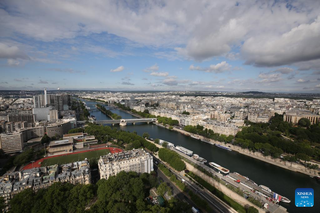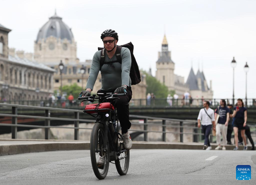 A biker passes by the Seine River in Paris, France, June 28, 2023. (Xinhua/Gao Jing)