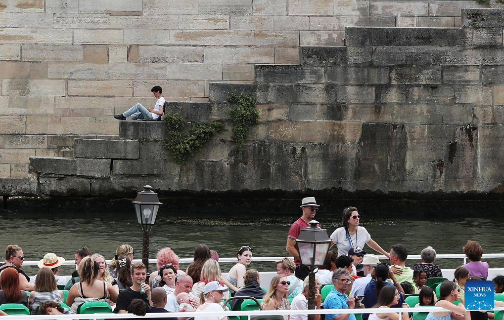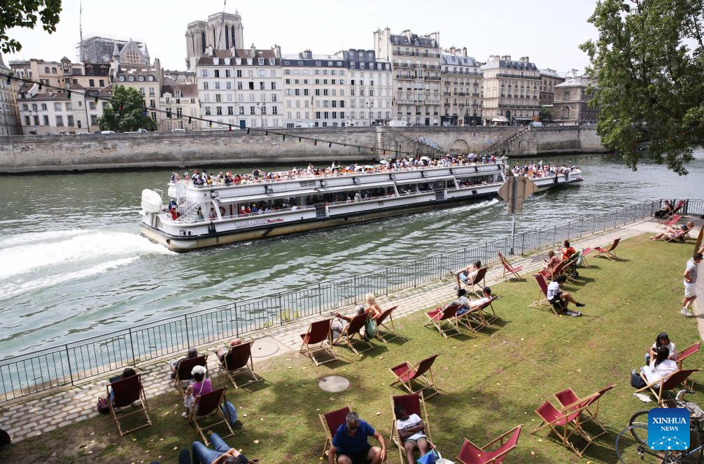 A man takes a rest by the Seine River as a tourist boat passes by him in Paris, France, June 28, 2023. (Xinhua/Gao Jing)
