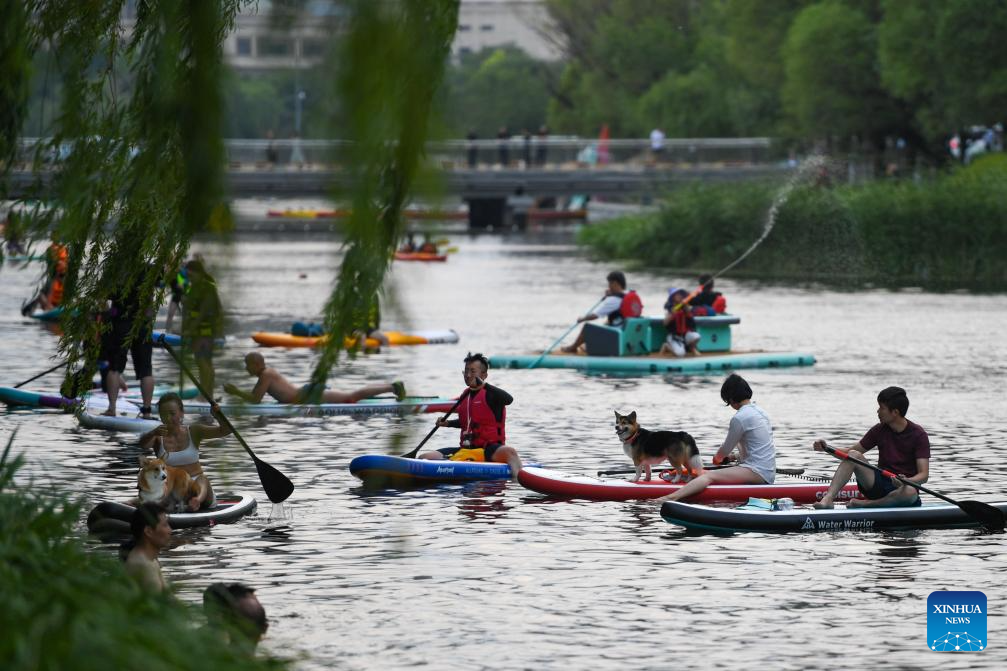 People enjoy paddleboarding on the Liangma River in Beijing, capital of China, June 17, 2023. (Xinhua/Chen Zhonghao)
