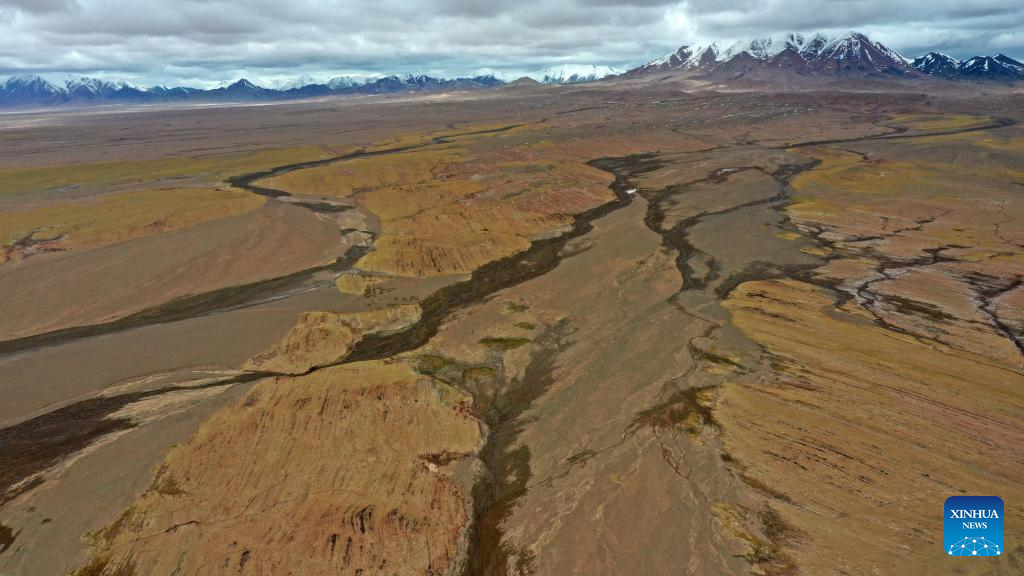 This aerial photo taken on June 30, 2023 shows a wetland in the Altun Mountains National Nature Reserve in northwest China's Xinjiang Uygur Autonomous Region. With an average altitude of 4,580 meters, the Altun Mountains National Nature Reserve covers a total area of 45,000 square kilometers and is a representative of plateau desert ecosystem in China. (Xinhua/Cai Yang)