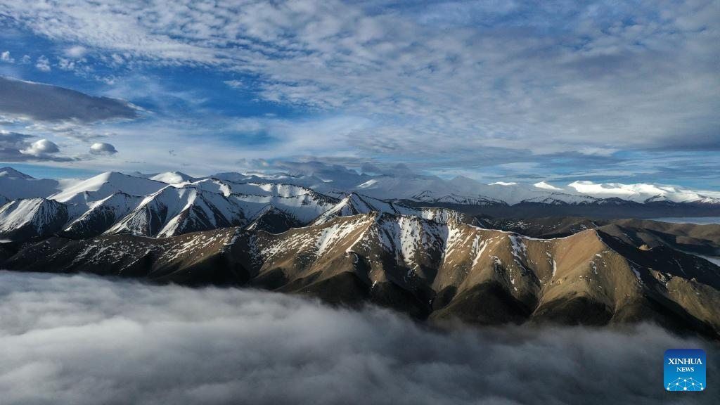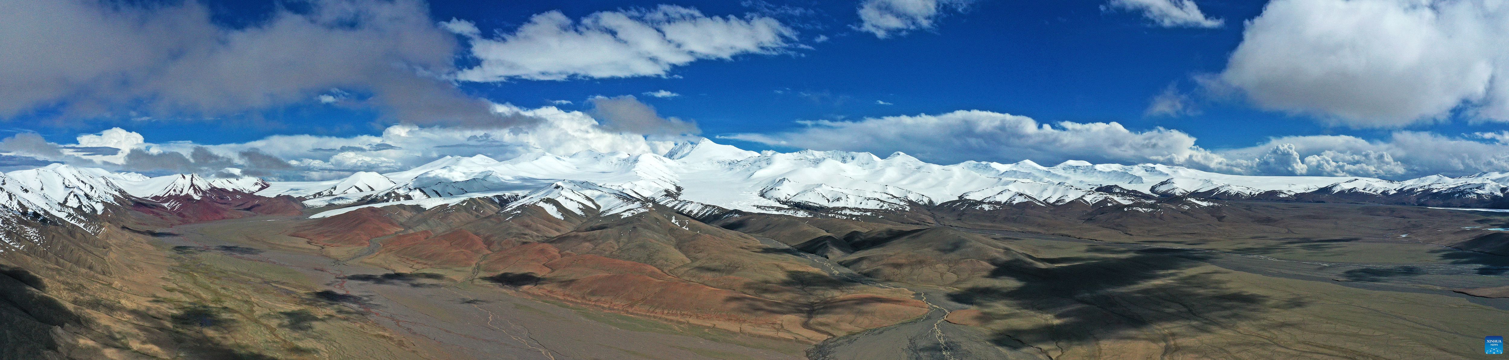 This aerial photo taken on July 8, 2023 shows snow mountains in the Altun Mountains National Nature Reserve in northwest China's Xinjiang Uygur Autonomous Region. With an average altitude of 4,580 meters, the Altun Mountains National Nature Reserve covers a total area of 45,000 square kilometers and is a representative of plateau desert ecosystem in China. (Xinhua/Wang Peng)