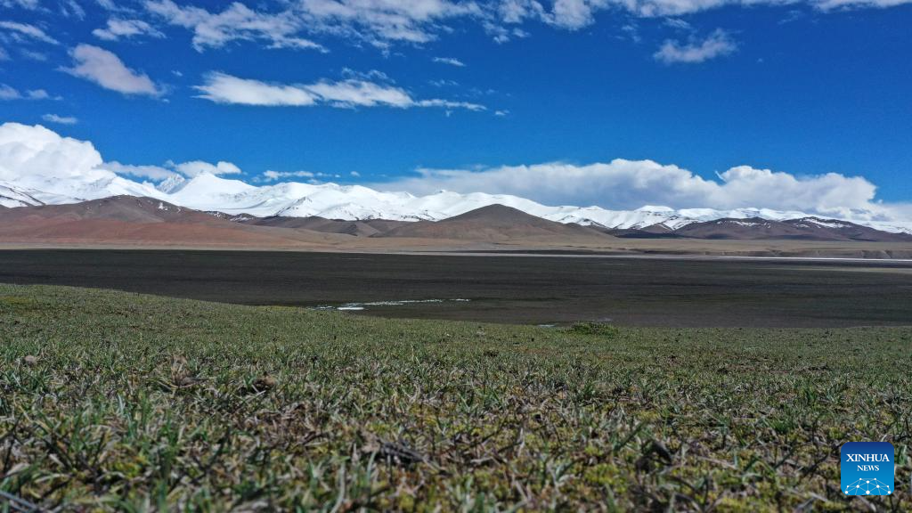 This photo taken on July 1, 2023 shows a wetland in the Altun Mountains National Nature Reserve in northwest China's Xinjiang Uygur Autonomous Region. With an average altitude of 4,580 meters, the Altun Mountains National Nature Reserve covers a total area of 45,000 square kilometers and is a representative of plateau desert ecosystem in China. (Xinhua/Cai Yang)