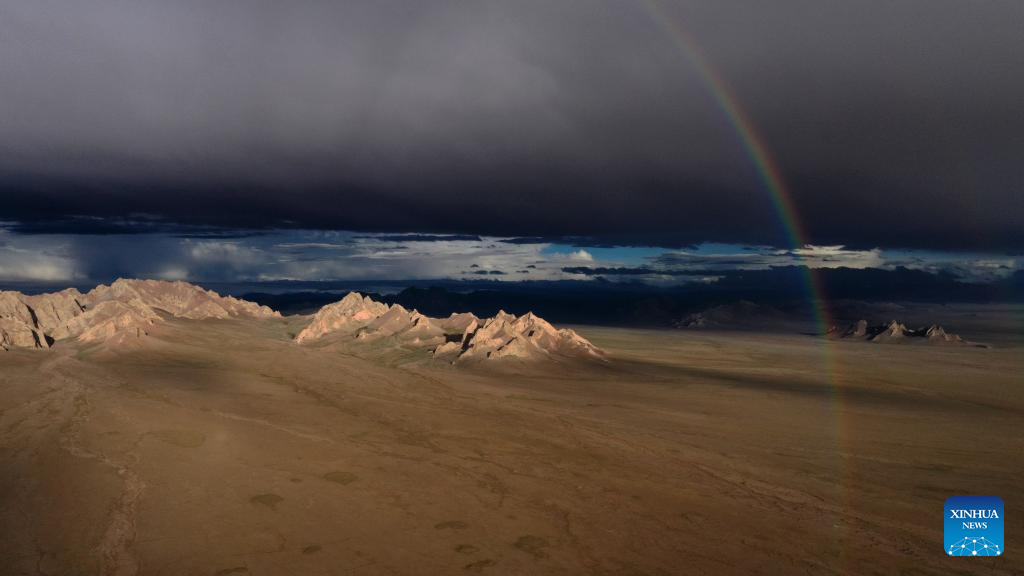 This aerial photo taken on July 10, 2023 shows a rainbow in the Altun Mountains National Nature Reserve in northwest China's Xinjiang Uygur Autonomous Region. With an average altitude of 4,580 meters, the Altun Mountains National Nature Reserve covers a total area of 45,000 square kilometers and is a representative of plateau desert ecosystem in China. (Xinhua/Wang Peng)