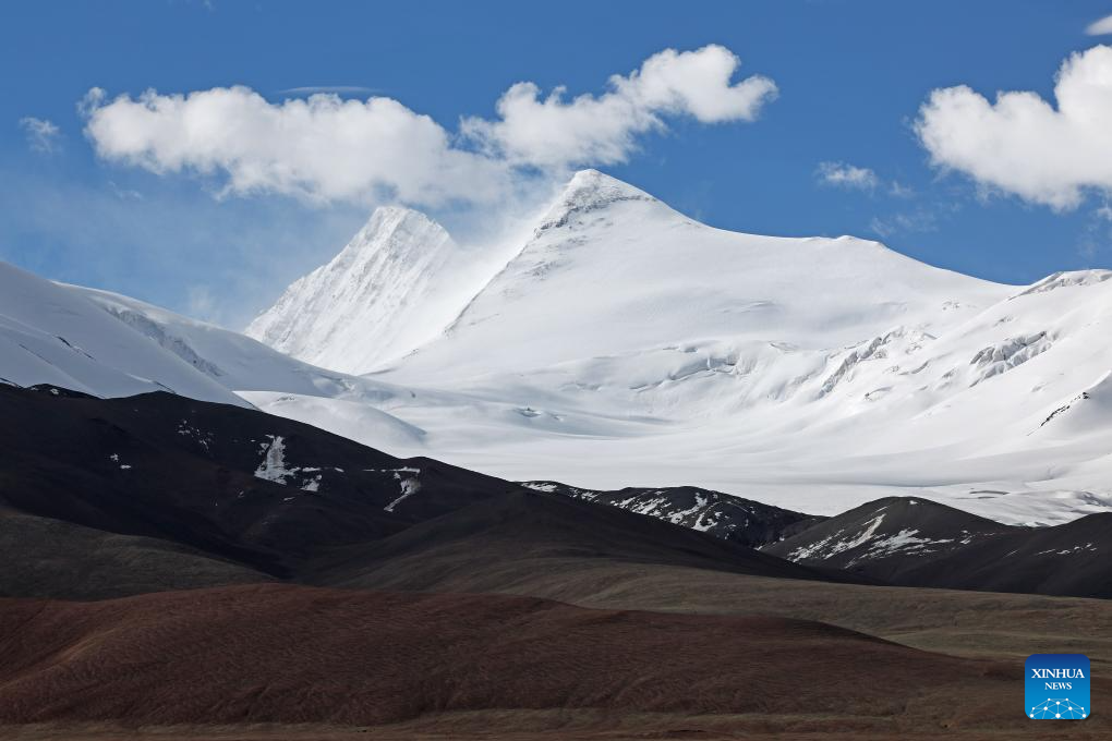 This photo taken on July 9, 2023 shows snow mountains in the Altun Mountains National Nature Reserve in northwest China's Xinjiang Uygur Autonomous Region. With an average altitude of 4,580 meters, the Altun Mountains National Nature Reserve covers a total area of 45,000 square kilometers and is a representative of plateau desert ecosystem in China. (Xinhua/Wang Peng)