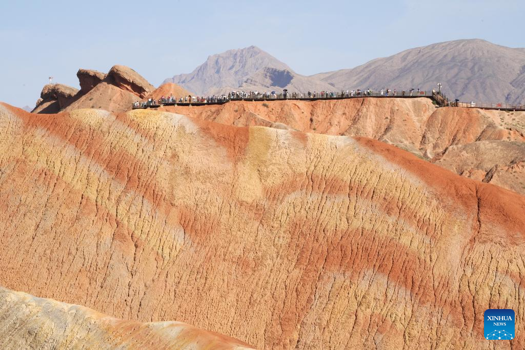 Tourists visit the Danxia National Geological Park in Zhangye, northwest China's Gansu Province, Aug. 7, 2023. Boasting a unique type of geomorphology formed from red-colored sandstones and characterized by steep cliffs, the Danxia National Geological Park has attracted an average of over 35,000 visitors daily since August. (Xinhua/Ma Ning)