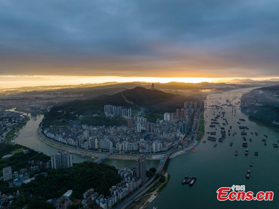 Cargo ships sail on Xijiang River under the shining morning glow, creating a golden scenery in Wuzhou, south China's Guangxi Zhuang Autonomous Region, Aug. 8, 2023. (Photo: China News Service/He Wenhua)