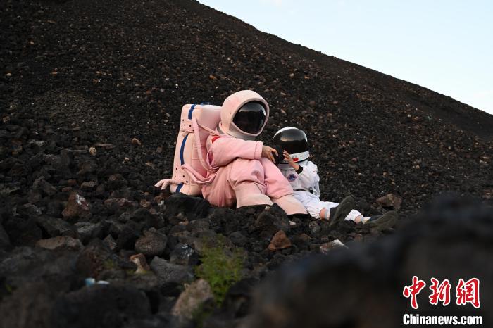 Tourists dressed in "space suits" pose for photos at the Ulan Hada volcano group in Ulanqab city, north China's Inner Mongolia Autonomous Region. (Chinanews.com/Liu Wenhua)