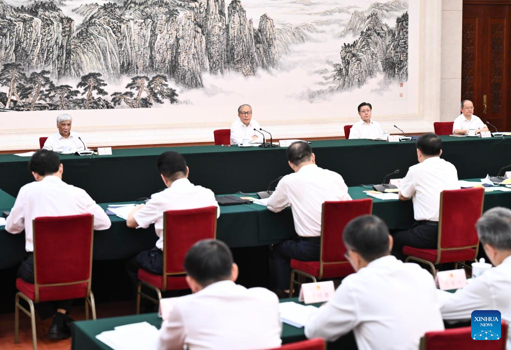 Li Hongzhong, a member of the Political Bureau of the Communist Party of China Central Committee and vice chairman of the Standing Committee of the National People's Congress, speaks at a symposium on implementing the law on ecological conservation on the Qinghai-Tibet Plateau, in Beijing, capital of China, Aug. 16, 2023. (Xinhua/Yan Yan)