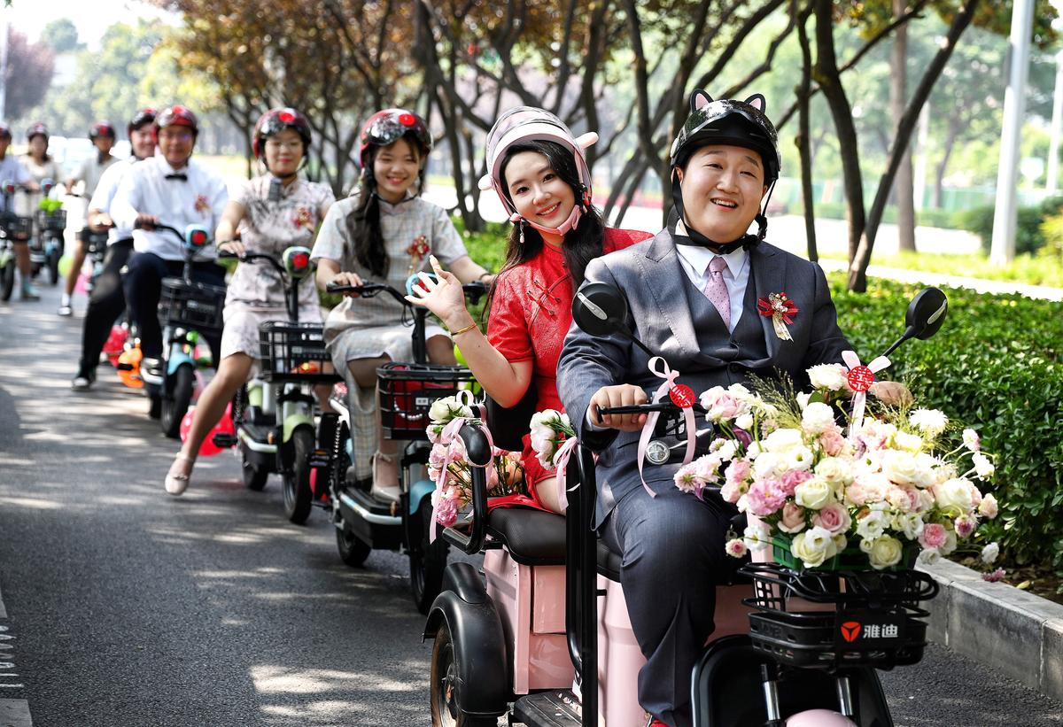 Groom in C China's Luoyang picks up bride with electric moped fleet