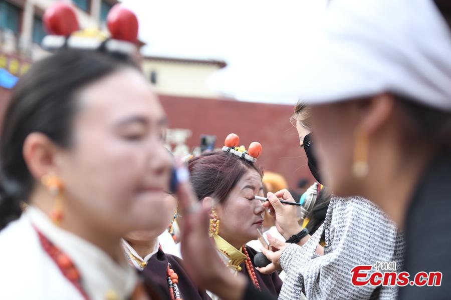 Tibetans put on makeup during a traditional Guozhuang dance contest at a local festival in Qamdo City, southwest China's Tibet Autonomous Region, Aug. 20, 2023. (Photo/China News Service)
