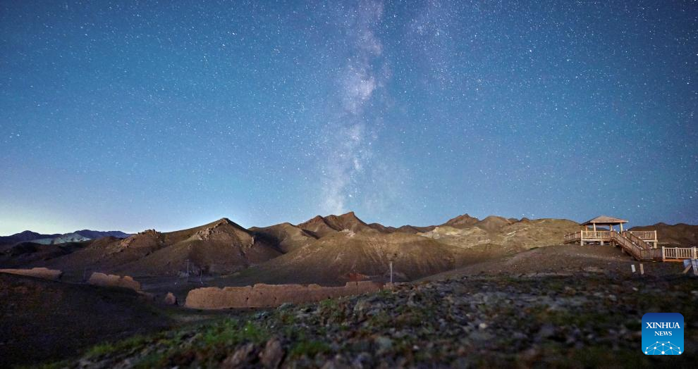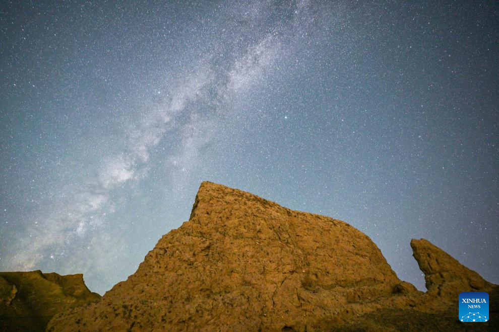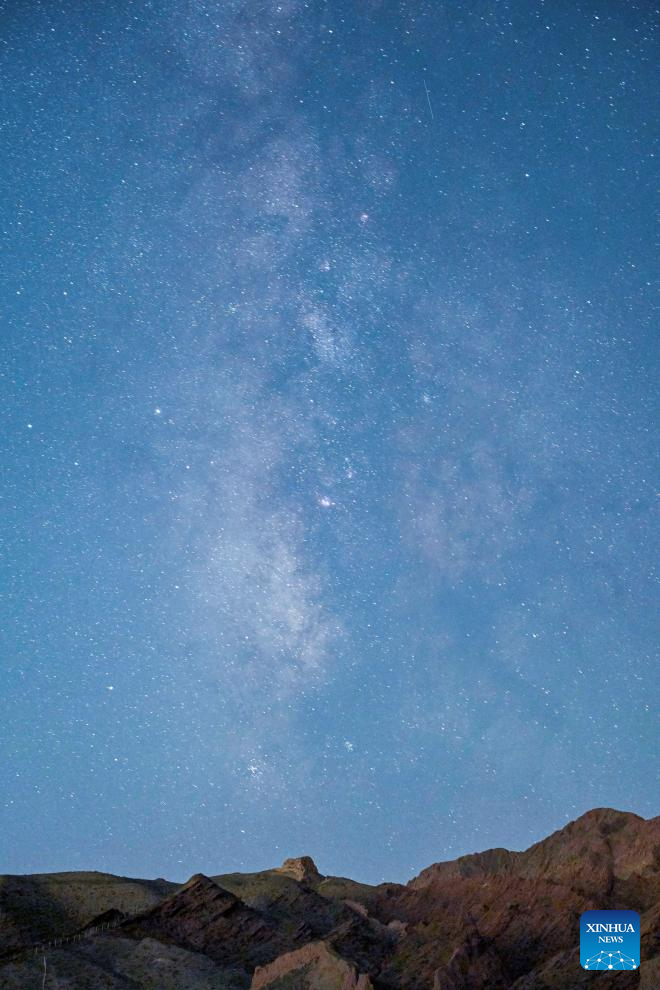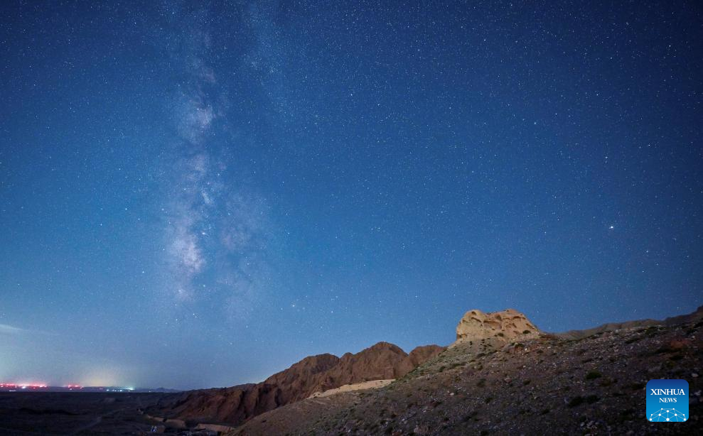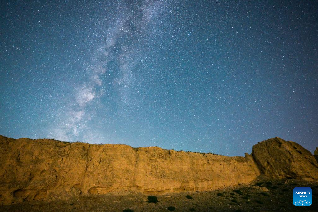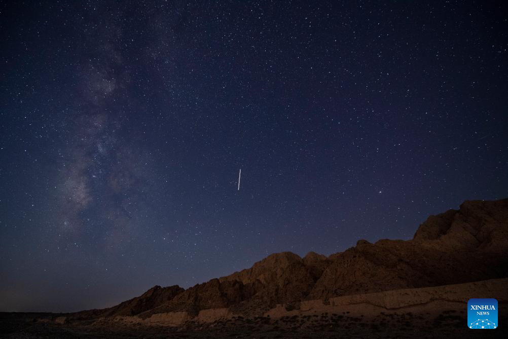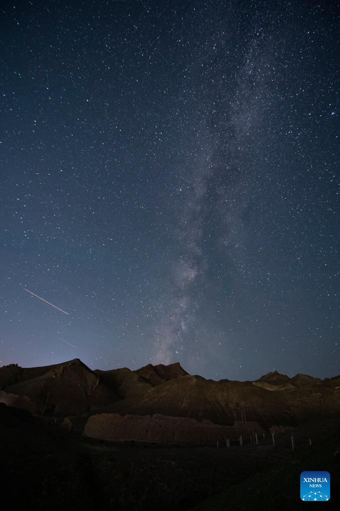 This long-time exposure photo taken on Aug. 21, 2023 shows a section of the Great Wall built in Ming dynasty (1368-1644) under the starry night sky in north China. (Xinhua/Liu Jinhai)